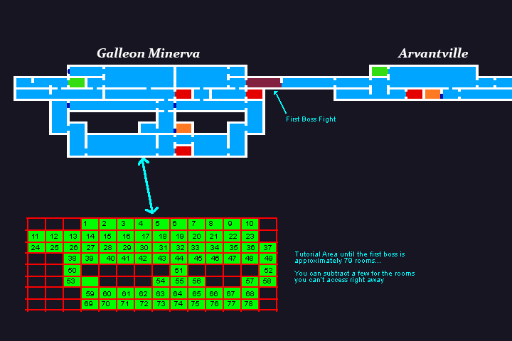 We turned to Bloodstained: Ritual of the Night, for an answer. Its intro sequence aboard a ship serves as a tutorial and culminates in a boss fight after about 80 rooms. We actually counted: